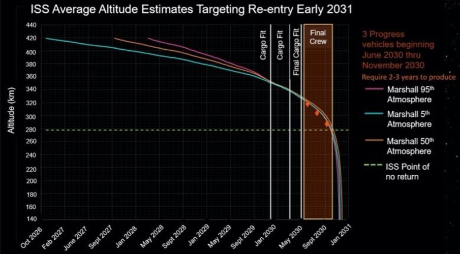 В конце срока работы МКС выполнит ряд маневров, чтобы начать медленное снижение рабочей высоты и спуск на Землю. Дело в том, что МКС слишком велика, чтобы просто сгореть в атмосфере, поэтому ее спуск должны точно контролировать.