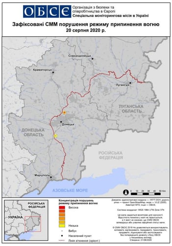 Наблюдатели ОБСЕ по состоянию на вечер 20 августа зафиксировали 634 нарушения всеобъемлющего прекращения огня на Донбассе с начала перемирия 27 июля.