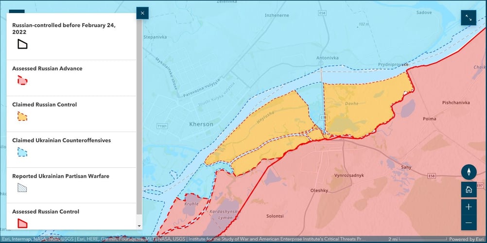 Аналитики Института изучения войны (ISW) заключили, что украинские военные по состоянию на 22 апреля заняли позиции на восточном (левом берегу) Херсонской области, из сообщений российских военных блогеров.