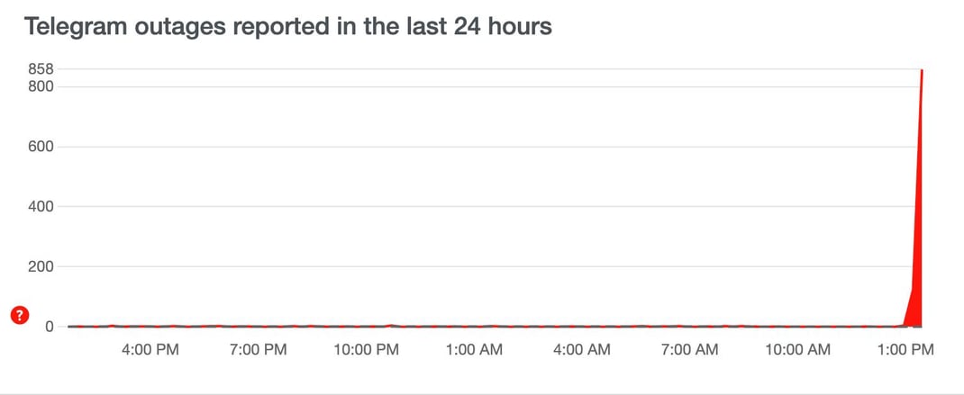 На графике от Downdetector — онлайн-платформы, которая предоставляет пользователям информацию в реальном времени о статусе различных веб-сайтов и служб, — видно резкое увеличение сообщений о сбоях в работе Telegram.