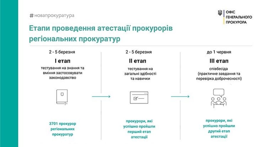 Как отмечают, процесс аттестации будет одинаковым для всех прокуроров и аналогичным процедуре аттестации в Офис генпрокурора. Он будет состоять из трех этапов — тестов на знание законодательства и на общие способности, а также собеседование с кадровой комиссией.