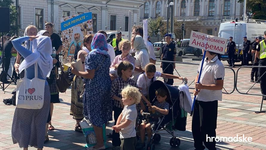 Под Верховной Радой в субботу, 21 августа, верующие Украинской православной церкви Московского патриархата протестовали против приезда в Киев Вселенского патриарха Варфоломея. Они высказывались против томоса о создании автокефальной Православной церкви Украины.