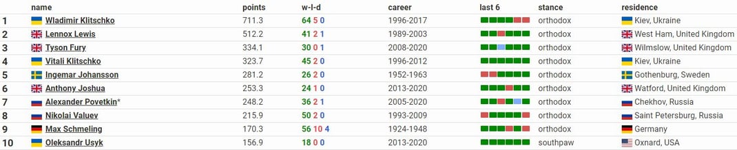Кроме того, десятку лучших боксеров Европы в тяжелом весе замыкает украинский спортсмен Александр Усик с 156.9 балла. За 7 лет карьеры боксера он победил в 18 поединках.