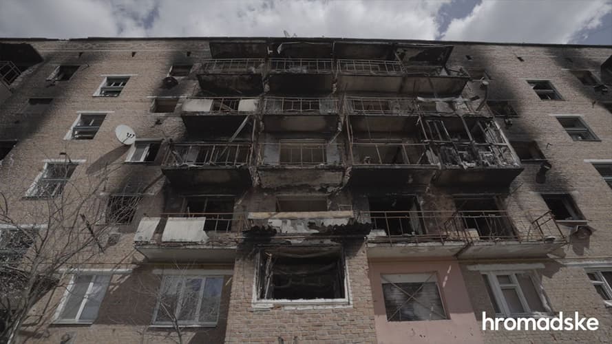 Черный, выжженный пятиэтажный дом напротив железнодорожного вокзала — как условный символ оккупации Тростянца. Если спросить людей, что больше всего пострадало в городе — они сразу же отправляют к этой пятиэтажке, что на улице Благовещенская, 53.