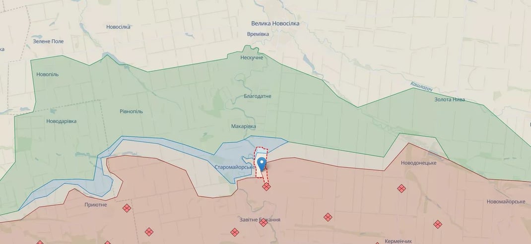 На кадрах также видно, что украинские войска продвинулись к Урожайному (9 километров к югу от Великой Новоселки) вдоль границы Донецкой и Запорожской областей.