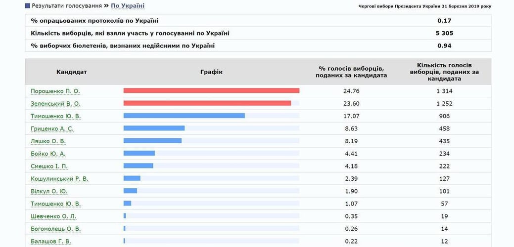 - ЦИК уже обработала 72% бюллетеней, наибольшее количество голосов набирает Владимир Зеленский — 30,44%. Порошенко 16,15% голосов, Юлия Тимошенко — 13,16%, Юрий Бойко — 11,54%, Анатолий Гриценко — 7,06%, Игорь Смешко — 5,95%, Олег Ляшко — 5,19%, Александр Вилкул — 4,31%, Руслан Кошулинский — 1, 65%. Другие кандидаты — менее одного процента.