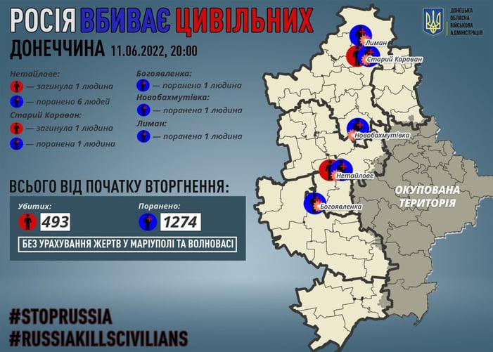 В целом с начала полномасштабной войны рф против Украины оккупанты убили в Донецкой области 493 мирных жителя. Еще 1 274 человека получили ранения.