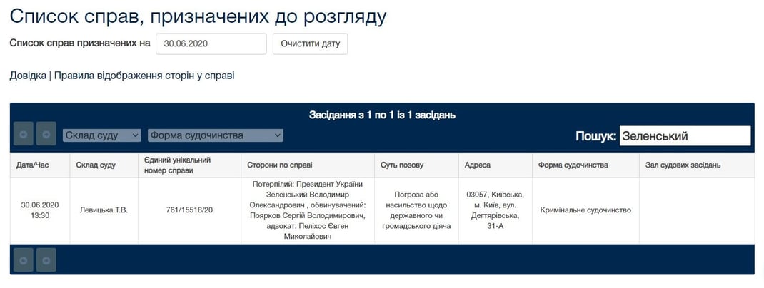 Зеленский в этом деле указан как потерпевший, а Поярков — обвиняемый. Также будет присутствовать адвокат Евгений Пелихос. Дело будет рассматривать судья Татьяна Левицкая.