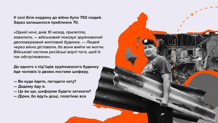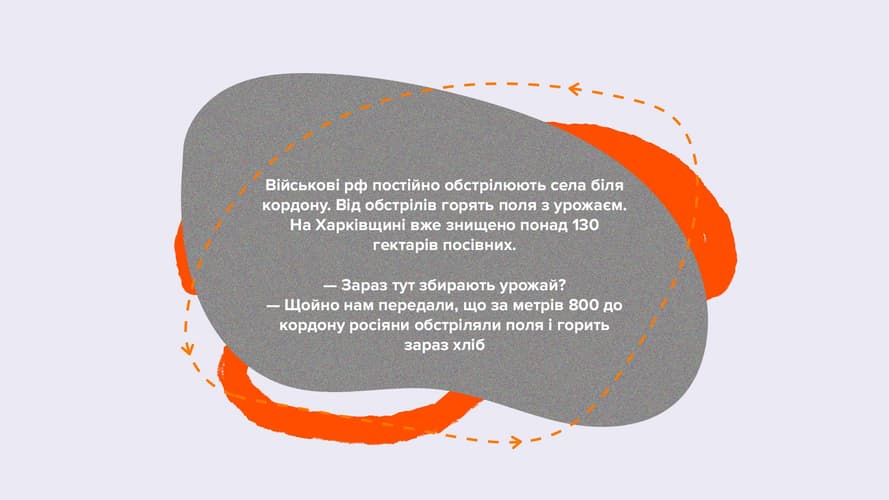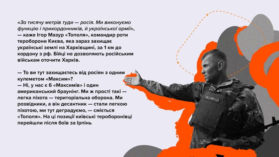 Харьковская область, до границы с россией всего километр. Здесь нет украинских пограничников. Да и украинские военные стоят поодаль от границы, потому что стоит лишь подойти — до предела — россияне обстреливают и их, и соседнее село из всего, то у них есть. Защищает этот участок украинской земли терроборона Киева, они перешли сюда после боев за Ирпень.