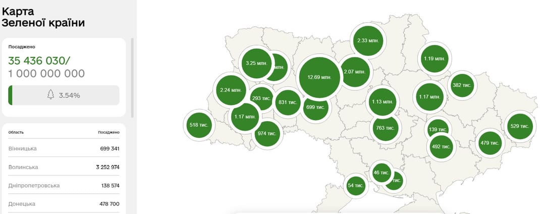 Сейчас больше всего посадили в Житомирской (12,6 миллиона деревьев) и Волынской областях (3,2 миллиона). Меньше всего — в Херсонской (19 086) и Николаевской (46 485) областях.