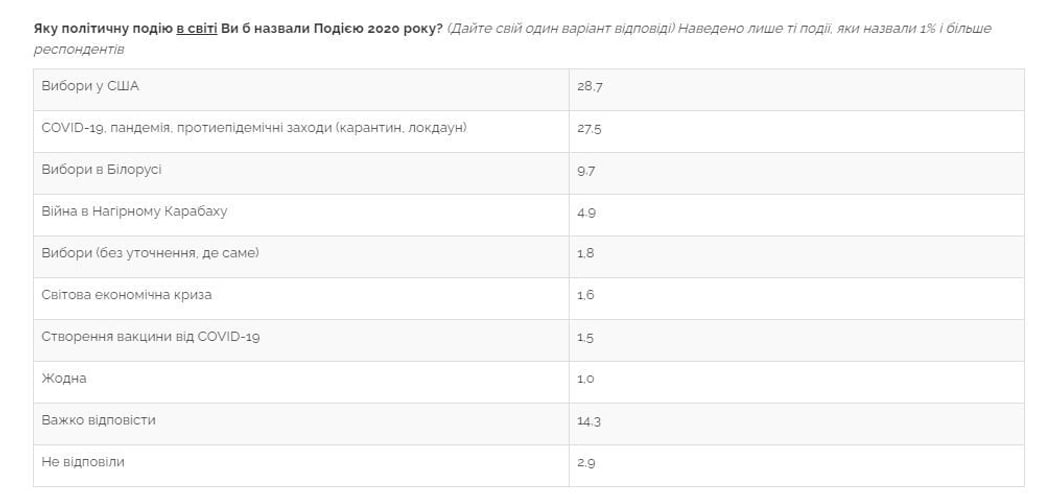 Главными политическими событиями 2020 года в мире украинцы назвали выборы в США (29%) и эпидемию COVID-19 и связанные с ней противоэпидемические меры (27,5%). 10% респондентов назвали выборы в Беларуси, 5% — войну в Нагорном Карабахе, 2% — мировой экономический кризис, 1,5% — создание вакцины от COVID-19.