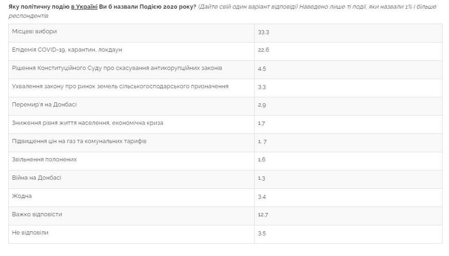 Главным политическим событием 2020 года в Украине считают местные выборы (их назвали в открытом вопросе 33% респондентов). Еще 23% назвали эпидемию COVID-19 и связанные с ней противоэпидемические меры (карантин, локдаун), а 4,5% опрошенных вспомнили решение Конституционного Суда об отмене антикоррупционных законов.