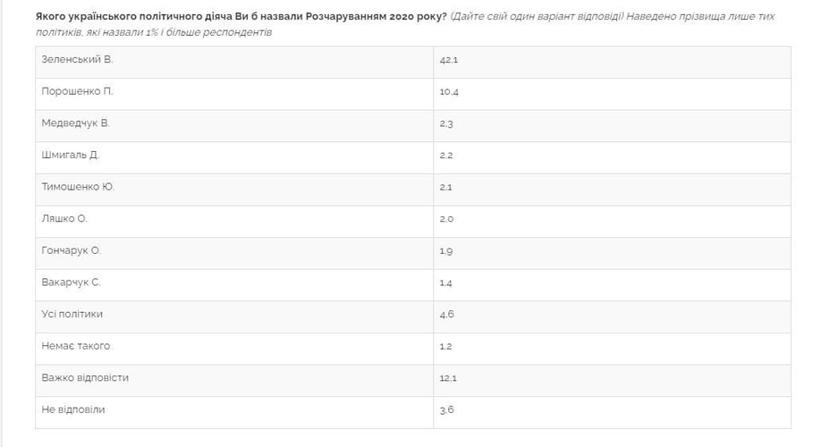 Несмотря на то, что для многих действующий президент стал разочарованием, 20% респондентов назвали его «Политиком 2020 года». Хотя этот показатель значительно меньше, чем в конце прошлого года — тогда «Политиком года» его назвали 46%.