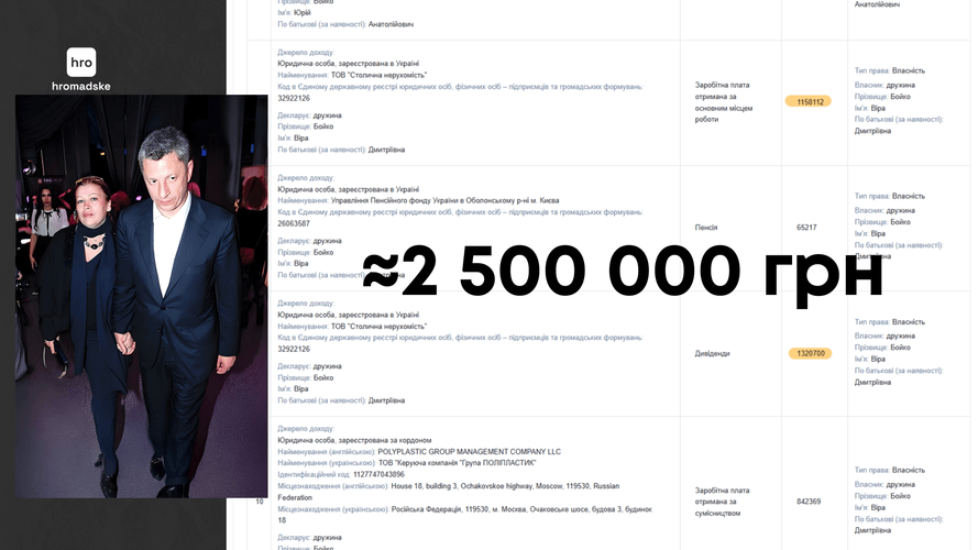 Отже, стартові інвестиції в будівництво трьох ЖК мали б становити близько 16 млн доларів — якщо рахувати за мінімальними ринковими цінами. Водночас у самого Бойка, офіційно не було та і досі немає жодних бізнес-активів. За декларацією, бізнес є тільки у його дружини Віри Бойко — це компанія «Столична нерухомість». На ті часи вона приносила десь 2,5 млн гривень доходів на рік.