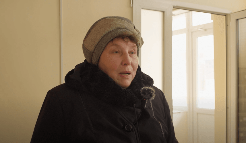 Дверь открывает 69-летняя Валентина Павловна, которая выходит, опираясь на костыль. Одета в теплую коричневую куртку, на руках — синие варежки, на голове — желтая вязаная повязка.