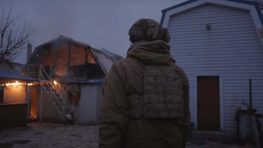 Иван — 22-летний командир взвода — заходит во двор пылающего дома. россияне разбили его утром, но уже вечер, а он до сих пор тлеет. Владельцы уехали раньше.