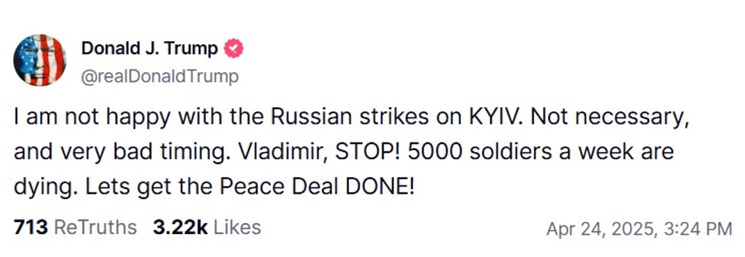 Еще недавно Трамп утверждал, что россия готова к заключению мирного соглашения и «хочет завершить войну», и поэтому теперь следует договориться с Украиной.