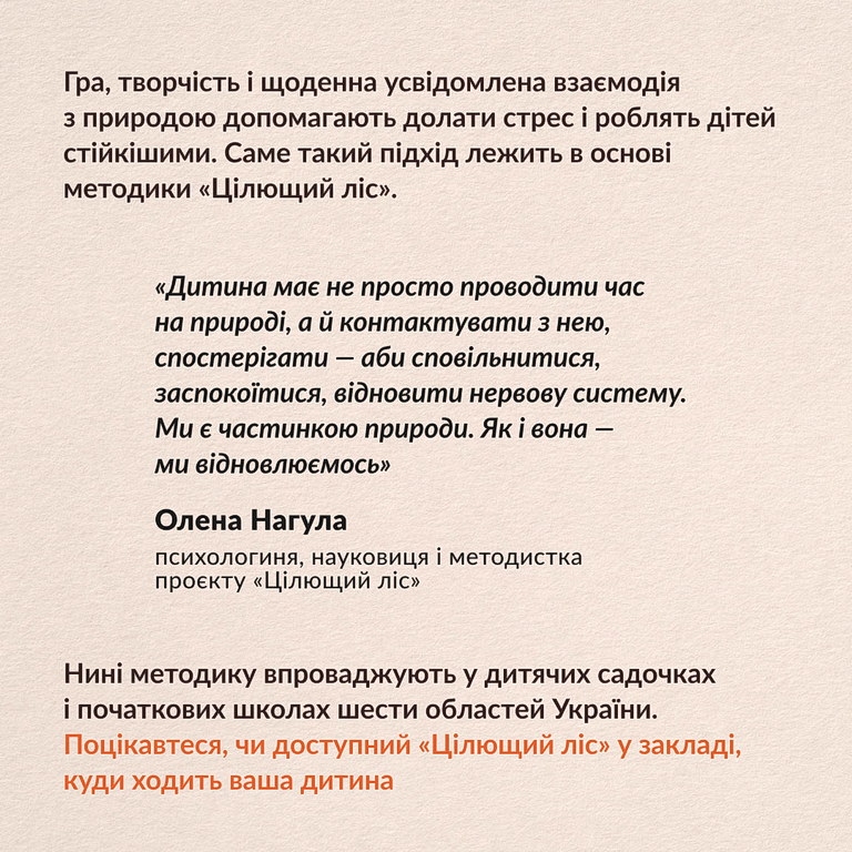 Поцікавтеся, чи доступний «Цілющий ліс» у закладі, куди ходить ваша дитина! Адже цієї весни вже понад 300 педагогів впроваджують методику в дитячих садках і школах Вінницької, Волинської, Івано-Франківської, Тернопільської, Черкаської областей та Києва.