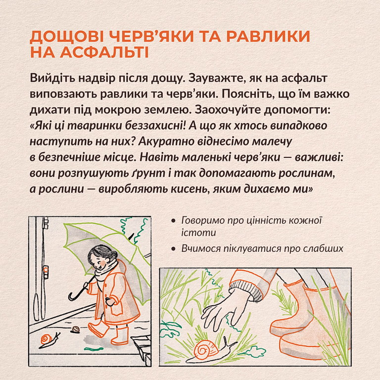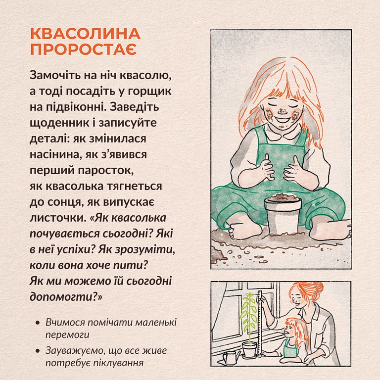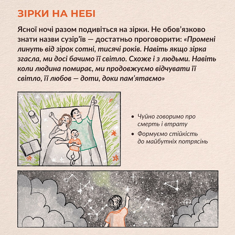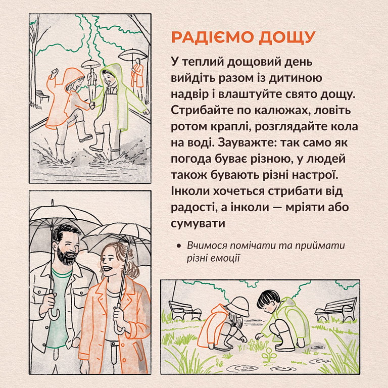 Найперше, що мають зробити батьки для своїх дітей, — знайти час на турботу про самих себе. Бодай 5 або 10 хвилин на день, якщо часу зовсім немає — вийти на прогулянку чи послухати музику, випити каву, почитати книжку. Це важлива частина психогігієни, як чистити зуби — частина гігієни фізичної. Особливо це необхідно сьогодні, коли ми збідніли через війну, через що дорослі часто-густо мусять працювати більше, щоб забезпечувати сімʼю.