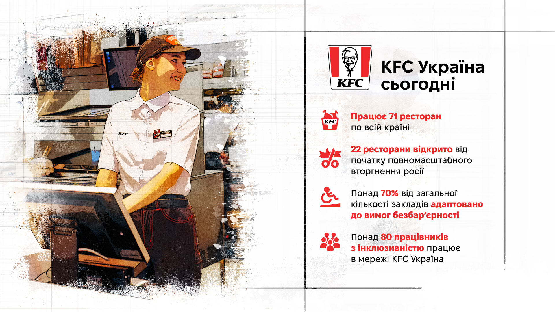 «Наша основна мета — щоб усі ресторани мережі стабільно відповідали інклюзивним стандартам та культура інклюзивності залишалася невіддільною частиною бренду — не проєктом, а саме стандартом мислення», — зазначає СЕО франчайзі KFC в Україні Аліна Кіптик.
