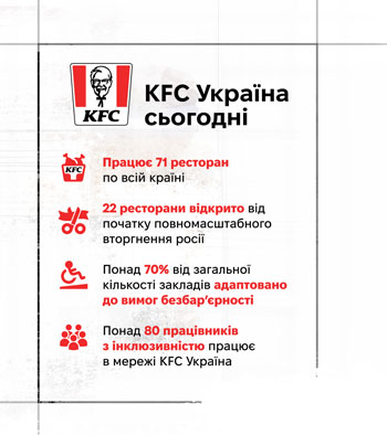 Але свій масштаб роботи «KFC Україна» оцінює не тільки в кількості відкритих ресторанів. У зростанні їм важливо зберегти високий рівень якості продукту і проявлятися як благодійники, що є частиною корпоративної культури. Мережа працює за глобальними принципами бренду. Це означає, що якість сервісу, комфорт гостей і продуманий простір закладів — не додаткові опції, а основа бізнес-моделі. В Україні ці принципи набувають особливого значення, бо для країни, що переживає війну, питання доступності, гідності й рівних можливостей перестають бути абстрактними.