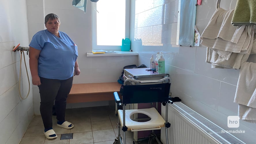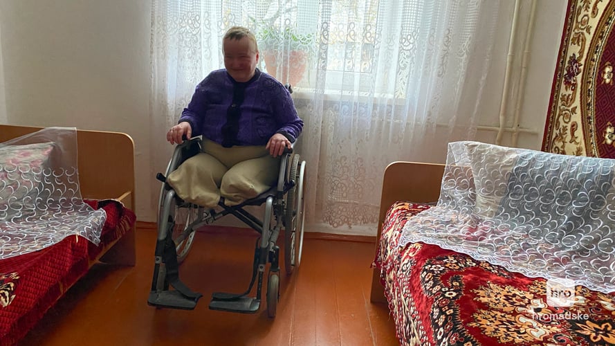 Жінка на колісному кріслі через ампутовані кінцівки. Має протези, працівники намагалися навчити її ходити, але поки що не вдається — Лариса все одно падає. До слова, реабілітолога та необхідного обладнання в інтернаті немає.