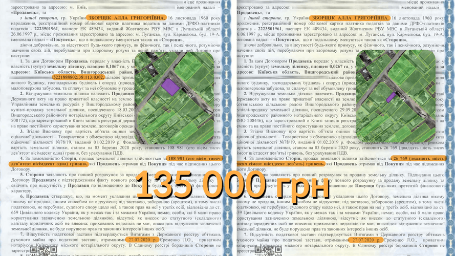А от дві земельні ділянки, на яких він збудований, належать мамі української чиновниці — Аллі Зборщік. Загалом 13 соток. Жінка купила їх 27 липня 2020 року — офіційно за 135 тисяч гривень.