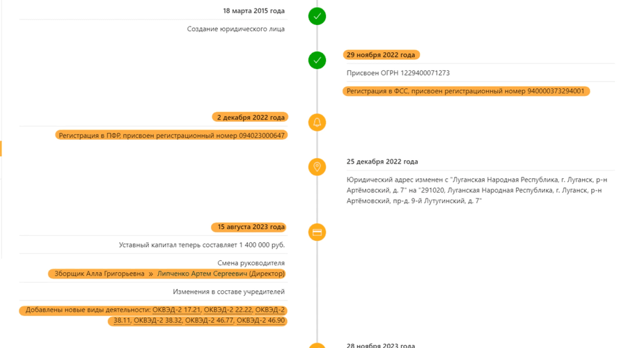 У 2022 році компанія зареєструвалася в російській податковій і соцфонді. А 15 серпня 2023 року відомості про вже ООО «Гранд» внесли до Єдиного державного реєстру юридичних осіб російської федерації.