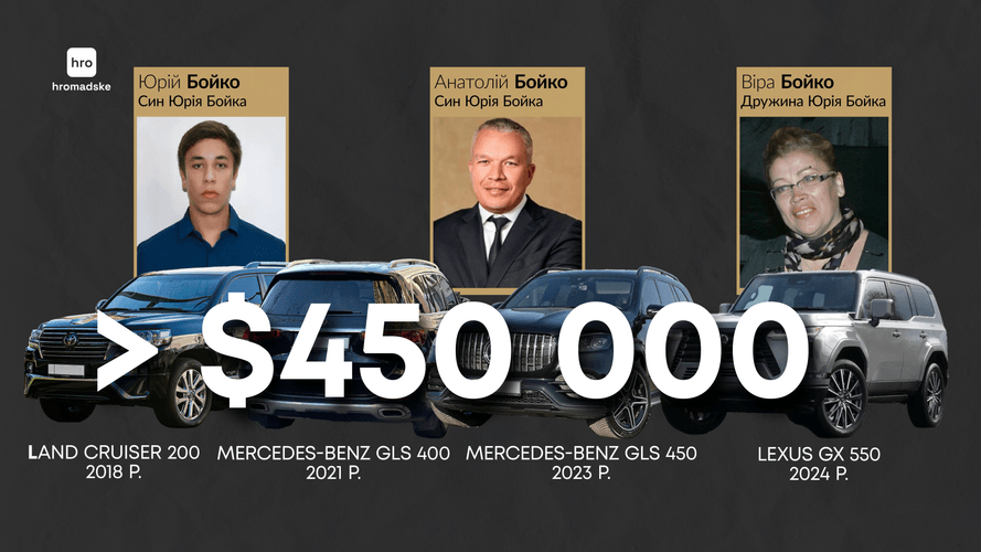 У дружини Юрія Бойка, Віри, офіційно немає авто. Але є ТОВ «Столична нерухомість», а на ній — Lexus GX550 2024 року випуску. Загальна вартість цих авто становить понад 450 000 доларів. Всі вони з’явились у родини з початку 2022 року.