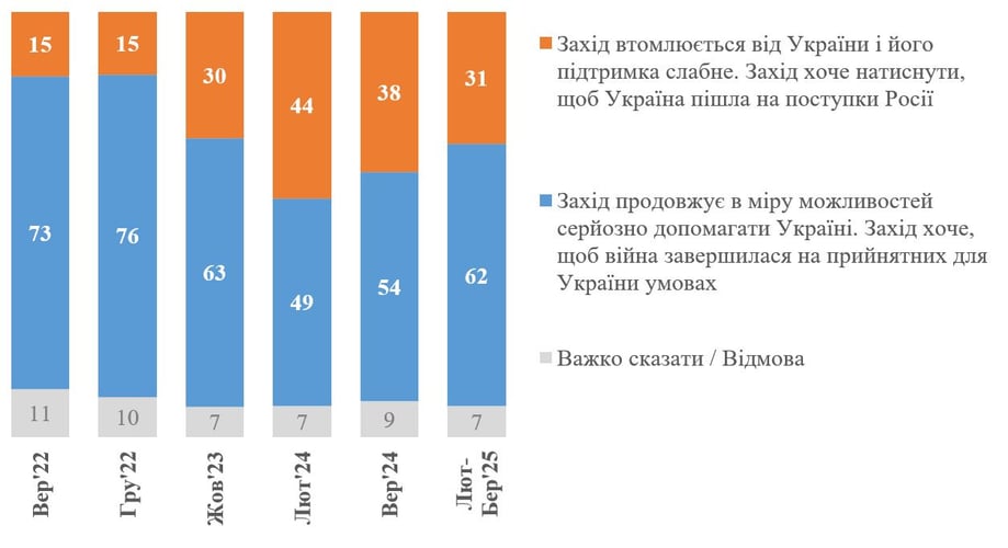 Без уточнення, що мається на увазі під політикою Заходу, нині 31% українців вважають, що Захід втомлюється і тисне на Україну (і, відповідно, не хоче прийнятного миру). 62% вважають Захід союзником і партнером у досягненні прийнятного миру.
