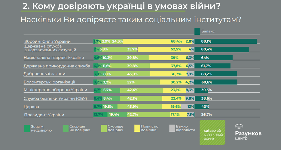 Президентові довіряють 59,8%, з них 42,7% радше довіряють, ніж ні, а 17,1% — довіряють повністю.