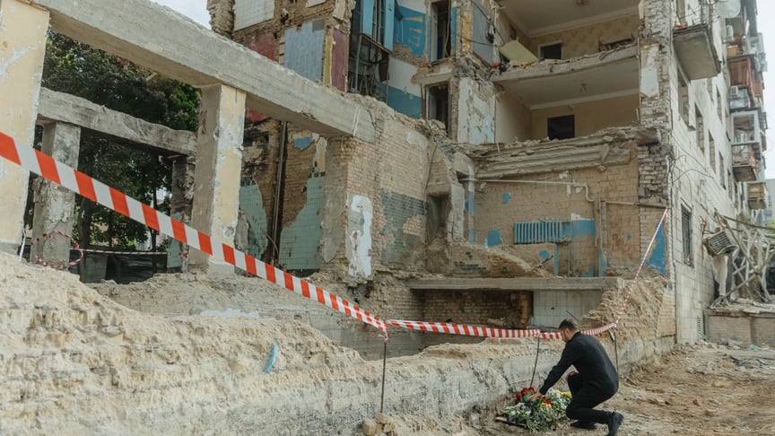 Зеленський поклав квіти біля багатоповерхівки у Києві, знищеної російським обстрілом