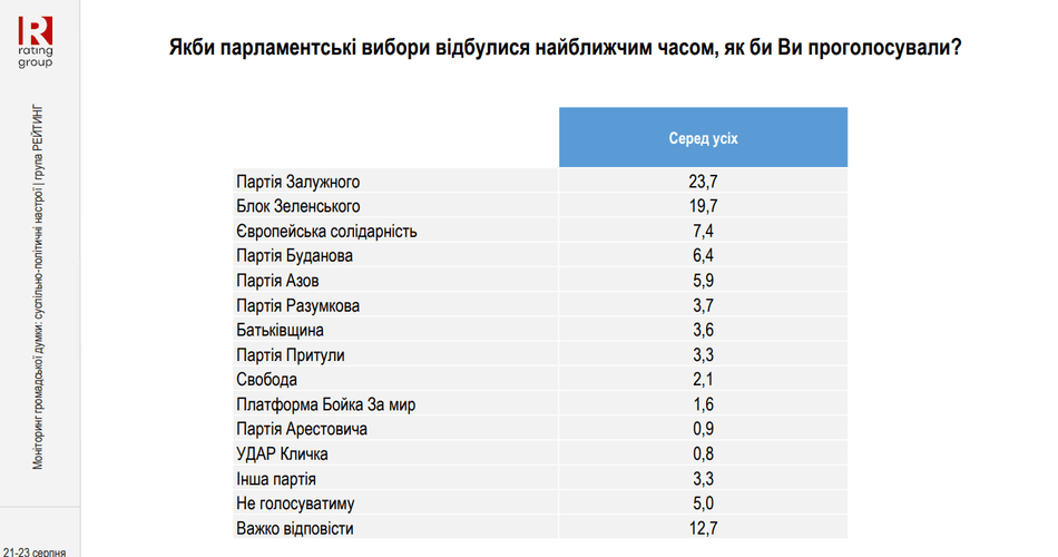 На парламентських виборах лідирувала б умовна Партія Залужного (24%), друге місце займав би умовний Блок Зеленського (20%). Далі йдуть «Європейська Солідарність» (7%), умовні Партія Буданова (6%) і Партія «Азов» (6%).