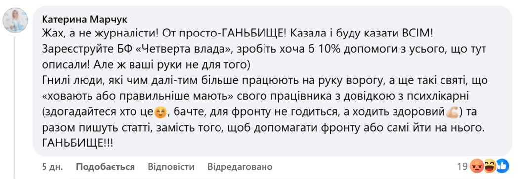 Під цим дописом свій коментар залишила його колега по партії «Рівне Разом» та депутатка Рівненської облради Катерина Марчук. Вона обурилася роботою «Четвертої влади», а також запропонувала їм зареєструвати власний благодійний фонд і зробити «хоча б 10% допомоги з усього, що тут описали».