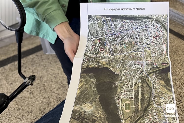 Чоловік показує на карті міста розроблений ним безбар’єрний маршрут (накреслений синім). Він проходить повз основні об’єкти: центр, міську раду, парки, лікарні, заклади освіти й культури. Де позначки з будиночками — там живуть ветерани. З інвалідностями після поранень їх у невеликому Чорткові лише декілька, тож усіх знають в обличчя й під них теж підлаштовують маршрут.
