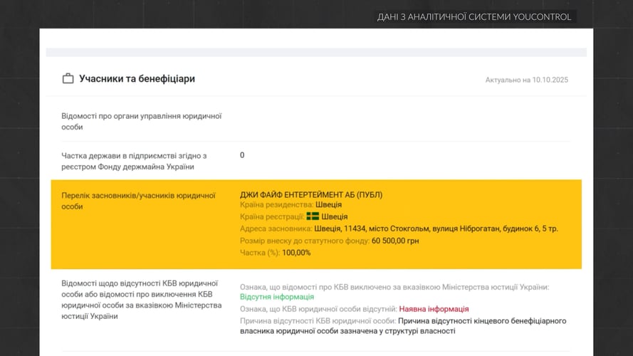 Українську «Джи Файв Холдинг Укр» заснувала і повністю контролює шведська «Джи файв ентертеймент». Водночас саме росіяни є одними з найбільших акціонерів шведської «Джи файв ентертеймент».