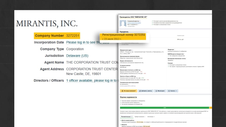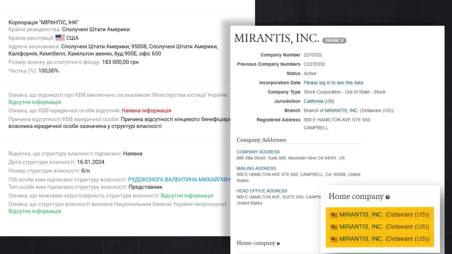 Українською компанією через американську Mirantis Inc з Каліфорнії, де-факто, володіє американська Mirantis Inc з Делаверу. Цій же, останній, американській компанії вже напряму належить російська «Мирантис АЙТИ».