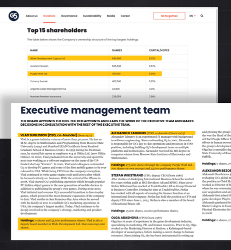 За двома компаніями зі списку найбільших акціонерів «Джи файв ентертеймент» — Wide Development і та Purple Wolf — стоять росіяни Влад Суглобов та Олександр Табунов. Цю інформацію шведська компанія оприлюднила у річному фінансовому звіті за 2024 рік.