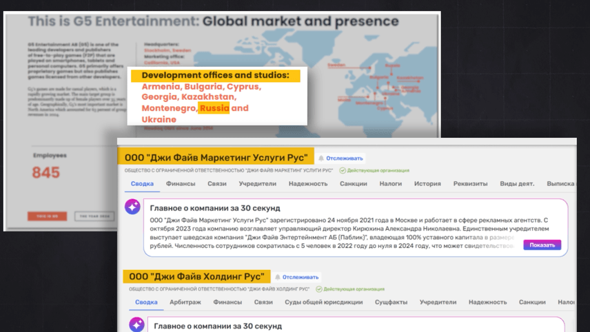 У цьому ж звіті зазначено, що шведська «Джи файв ентертеймент» і досі працює в росії. Вона залишається співзасновницею двох російських компаній: «Джи файв маркетинг услуги» та «Джи файв холдинг». Перша — поступово припиняє діяльність, друга — торік заробила 48 млн рублів.