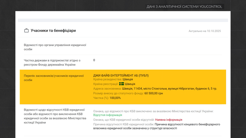 Попри ці зв’язки «Джи Файв Холдинг Укр», яка контролюється шведською «Джи файв ентертеймент», користується державними податковими пільгами, а ще — у 2024-му році забронювала 67 своїх працівників.