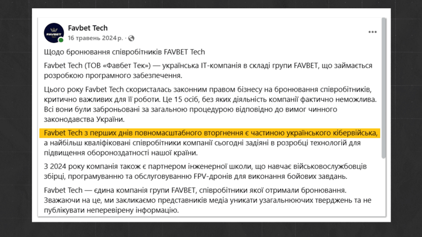 У квітні 2024 року низка компаній, далеких від поняття «критичності», вирішила забронювати своїх співробітників. Так 15 працівників забронювала «Фавбет Тек».