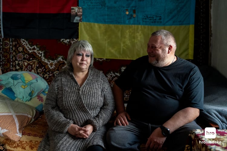 На стіні в дмитрівській хатці теж висять зшиті Ліною український і червоно-чорний прапори. На їхньому фоні подружжя й позує нам для фотографії.
