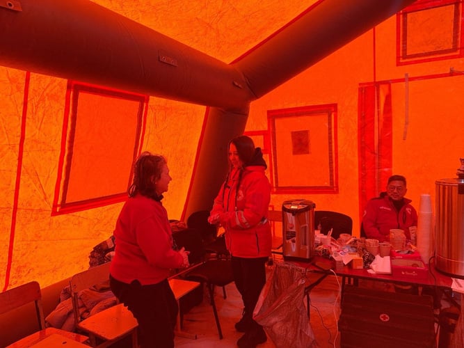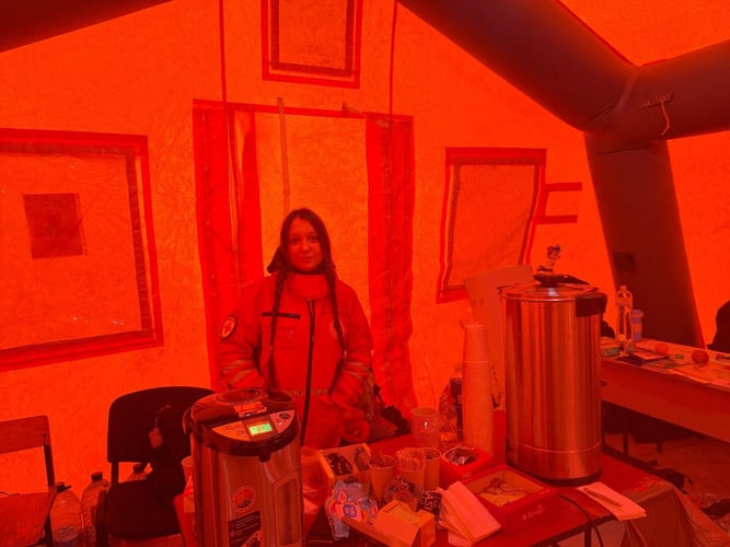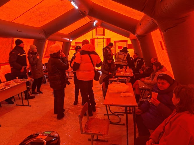 У «Пункті незламності», в який ходила жінка, у понеділок людей обмаль. Це намет від ДСНС і Червоного Хреста. Заходжу і відразу пітніють окуляри, за хвилину розстібаю куртку, так тут жарко. Але ноги з часом холонуть, бо намет розташований на мерзлій землі, тоненька плівка замість підлоги не дає тепла.