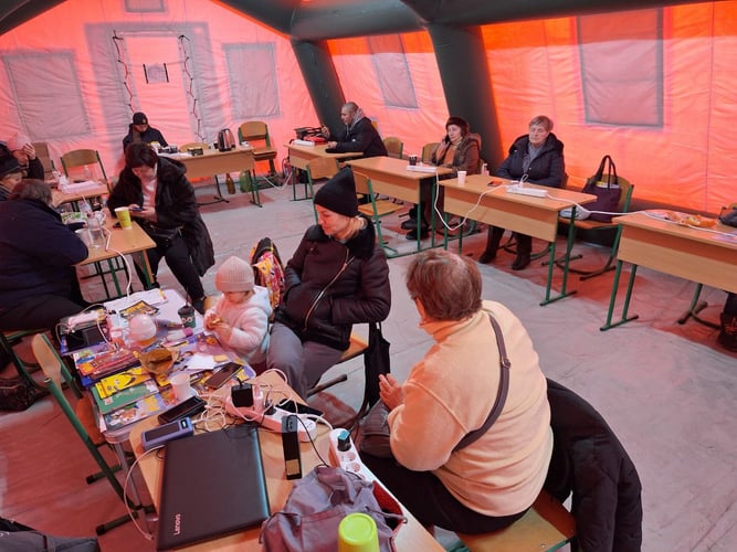 У помаранчевому наметі ДСНС — «Пункті незламності», за 30 метрів від станції метро Деміївська — зо півтора десятка людей. Всі заряджають гаджети, вряди-годи хтось п’є каву чи чай, яку розливають надзвичайники.