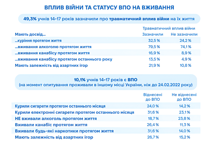 Майже половина опитаних підлітків каже, що війна впливає на них травматично. Дані ESPAD демонструють чіткий зв’язок між пережитим стресом, досвідом вимушеного переїзду й зростанням ризикованих практик. Підлітки-переселенці або ті, які постраждали через війну, значно частіше повідомляють про досвід вживання алкоголю, канабісу й інших психоактивних речовин, а також про досвід азартних ігор.