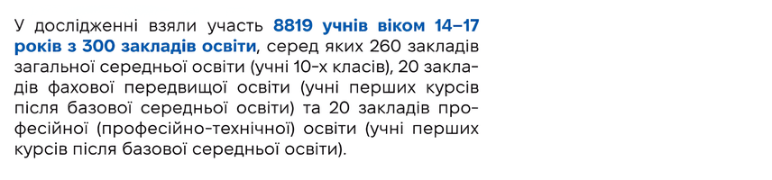 У 2024 році до вибірки увійшли тільки ті області, де діти навчаються очно, а проводити опитування було безпечно. Окуповані й прифронтові регіони, а також ті, де навчання було дистанційним, охопити не змогли. А втім, це, за словами Тетяни Бондар, не робить результати некоректними, адже вибірка є репрезентативною.