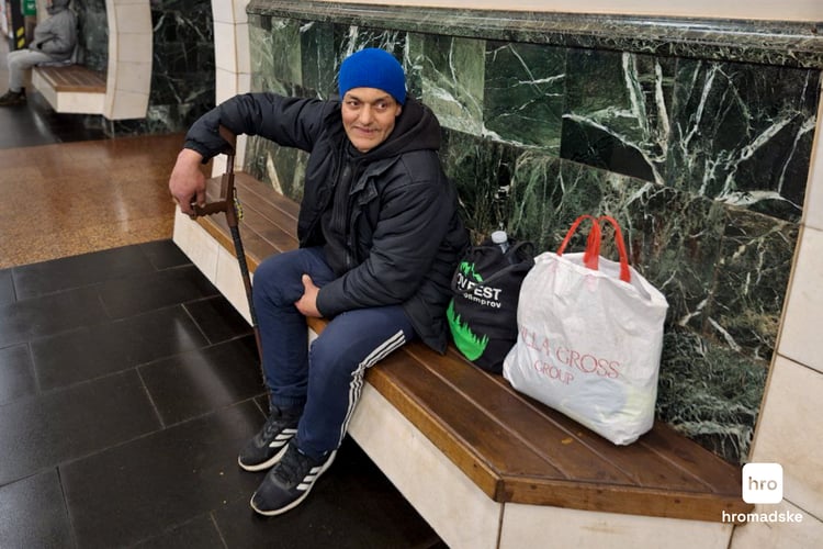 «Я живу за три зупинки звідси. У мене 9-й поверх, а в сусідній будинок двічі прилітало, то нам повибивало шибки. Коли була жива дружина, приходили сюди інколи удвох, але її не стало рік тому, — чоловік на мить замовкає. — Тепер я щоночі тут».