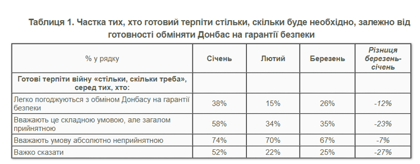 Соціологи кажуть, що вирішили проаналізувати, серед яких категорій населення відбулося зниження частки тих, хто готовий терпіти стільки, скільки буде необхідно. Як виявилося, найбільш диференційоване зниження відбулося залежно від ставлення до пропозиції обміняти Донецьку область на гарантії безпеки.