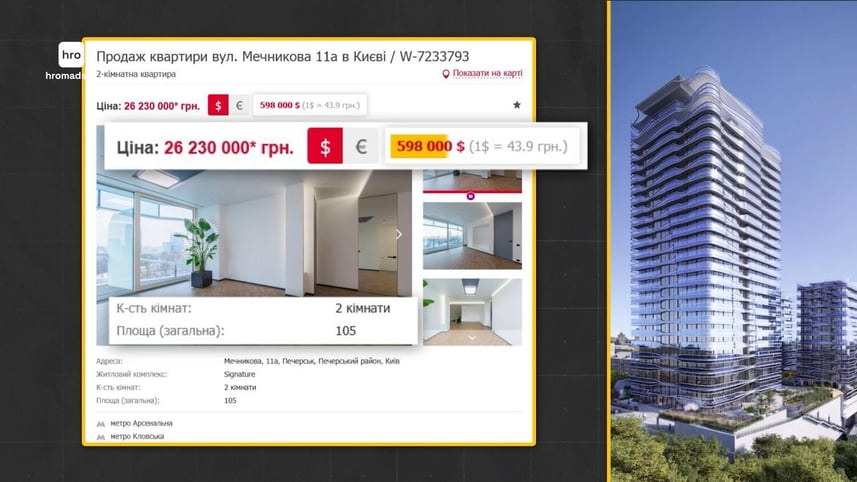 «Це неможлива ціна. Ну, тобто, якби ми навіть казали не про конкретний ЖК, а просто про вулицю. Вулиця Мечникова — одна з найдорожчих вулиць в Україні, тому що там дуже класна інфраструктура. Там ціна у старому фонді у 2023 році була 1500-2000 доларів за метр квадратний, якщо там якісь є суперпогані умови. У конкретному ЖК Signature на той момент ціна була 2500-3000 доларів», — пояснив hromadske рієлтор Олексій Гнучіх.
