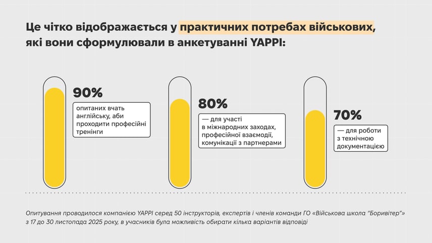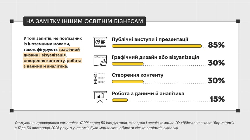 Анкетування показало цікаву тенденцію: військові прагнуть розвивати не лише мовні компетенції, а й широкий спектр професійних і міжособистісних навичок, так званих hard і soft skills.